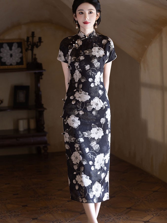 2026 Black Floral Print Mothers Cheongsam Qipao Dress