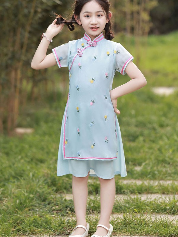 2026 Blue Embroidered Kids Girls Cheongsam Qipao Dress
