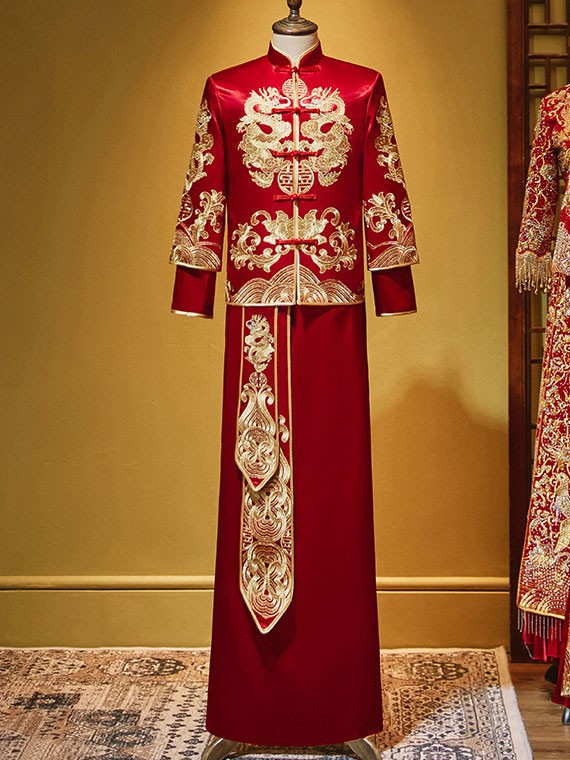 2026 Embroidered Dragon Men Wedding Qun Kwa Jacket & Skirt