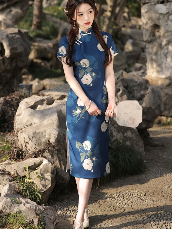 2026 Summer Blue Floral Tea Cheongsam Qipao Dress