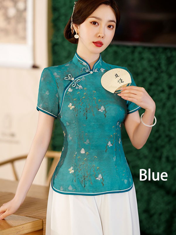 2026 Summer Floral Linen Cheongsam Blouse Top