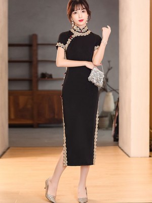 Black Lace Trim Modern Qipao / Cheongsam Dress