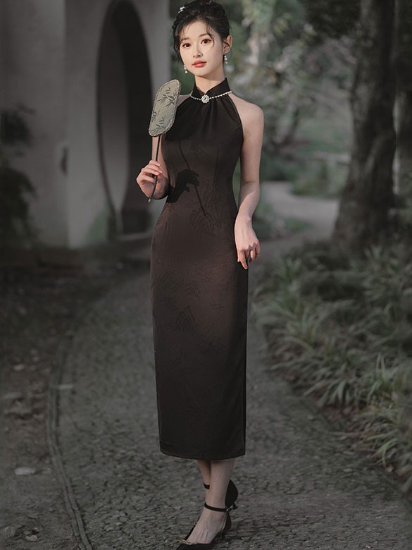 Black Pink Jacquard Halter Cheongsam Qipao Dress