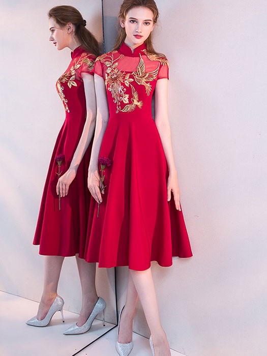 Burgundy A-line Midi Cheongsam Qipao Dress