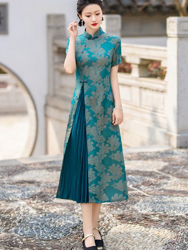 Clearance Fuchsia Blue Jacquard Mothers A-Line Cheongsam Dress