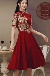 - Burgundy A-line Midi Cheongsam Qipao Dress