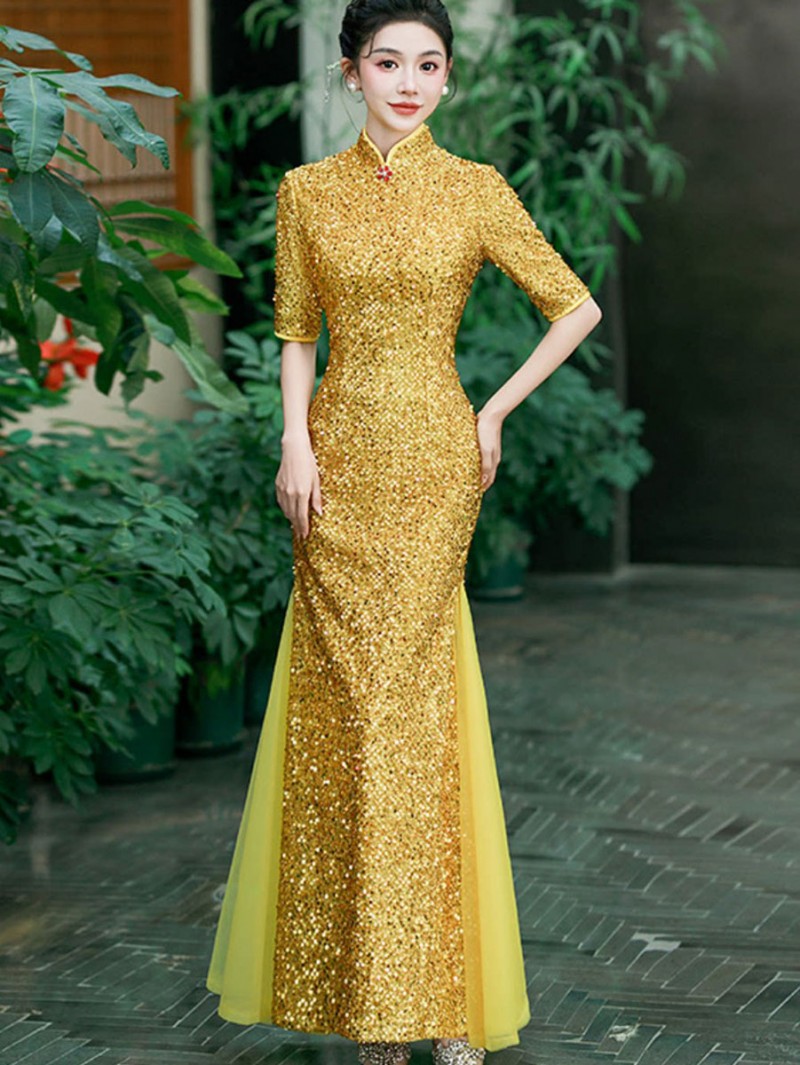 Gold Silver Sequins Long Cheongsam Qipao Dress