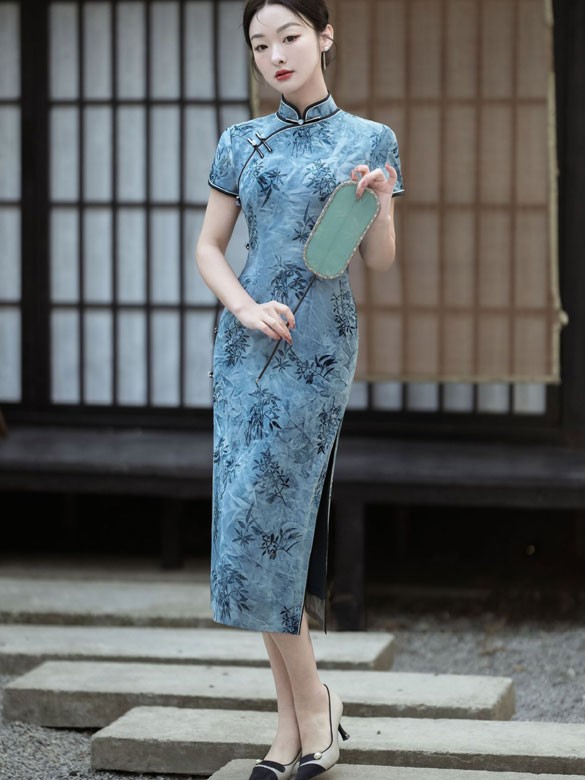 Gray Floral Print Midi Cheongsam Qipao Dress
