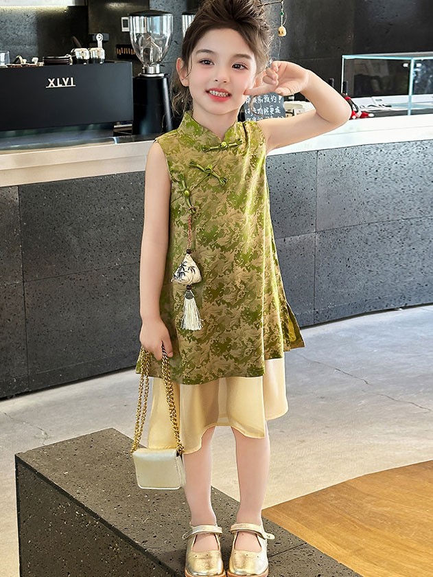 Green Jacquard Kids Girls Qipao Cheongsam Dress