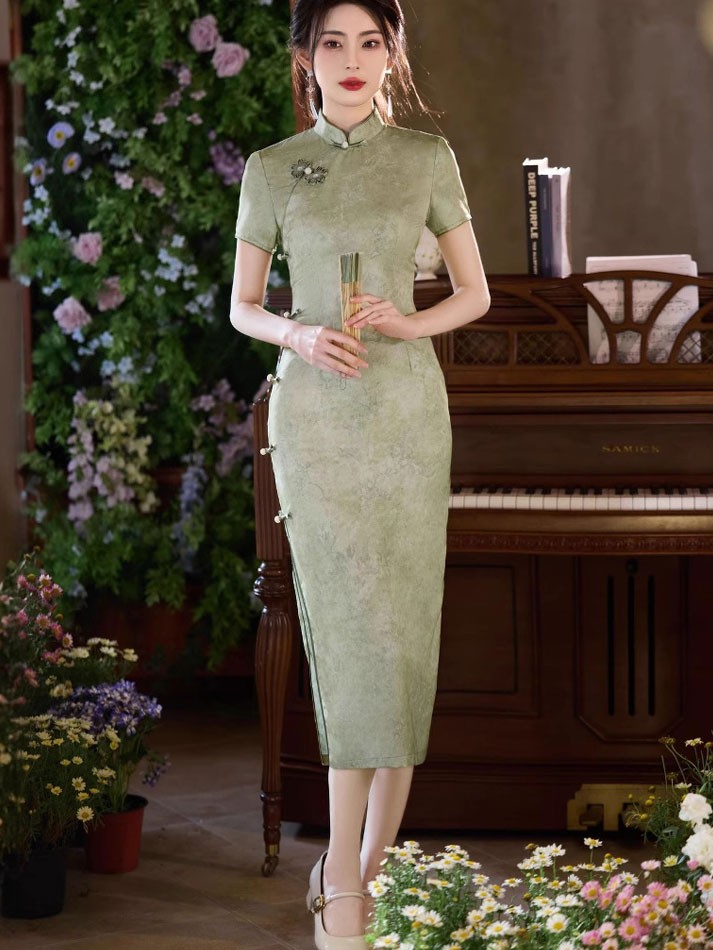 Green Jacquard Midi Cheongsam Qipao Dress