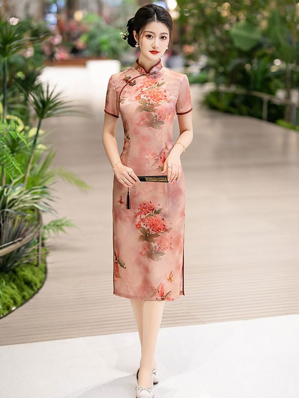 Pink Floral Print Midi Cheongsam Qipao Dress