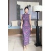 Purple Butterfly Floral Print Long Cheongsam Qipao Dress