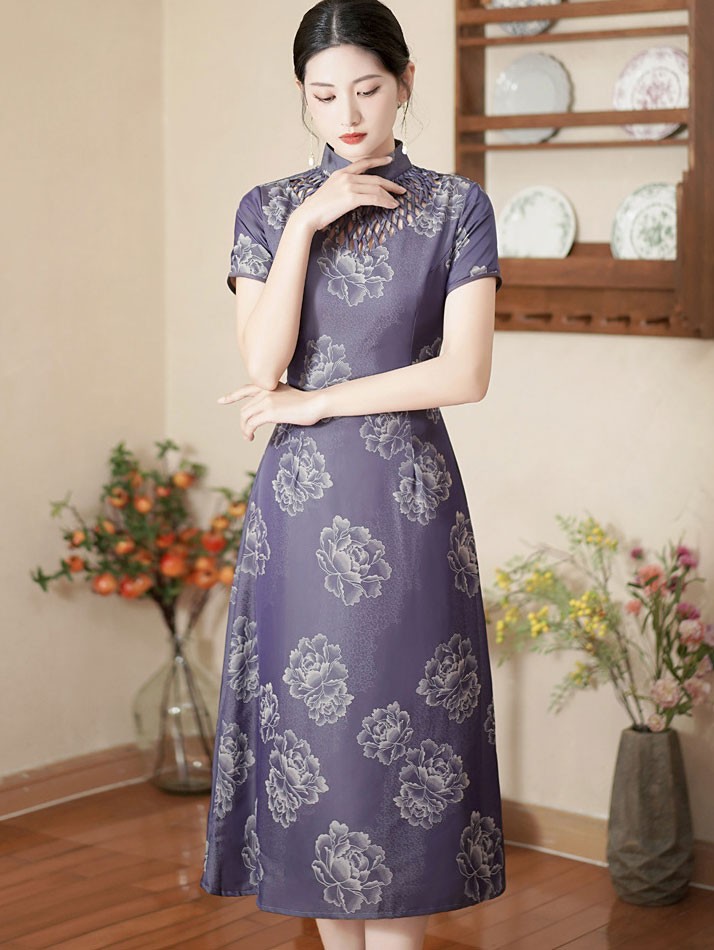 Purple Floral Print Mothers A-Line Cheongsam Qipao Dress