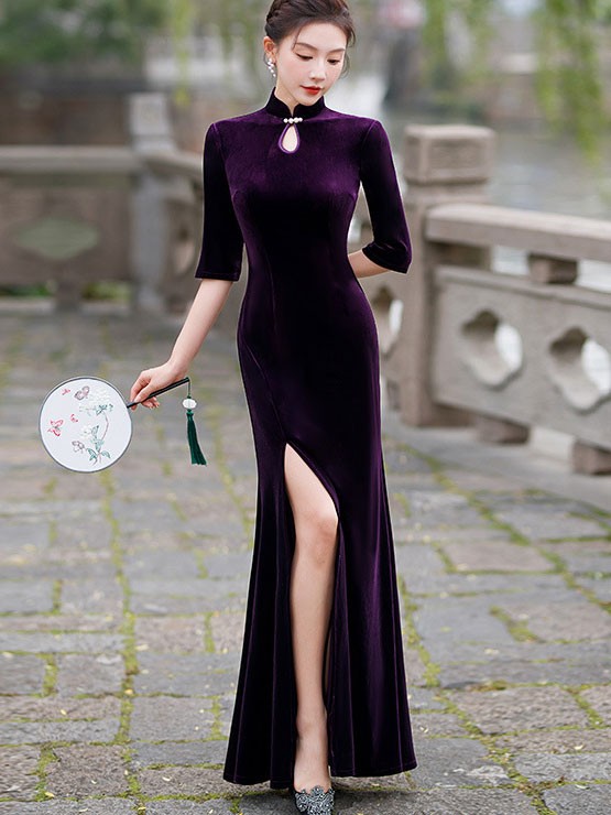 Velvet Red Purple Thigh Split Fishtail Qipao Cheongsam Dress