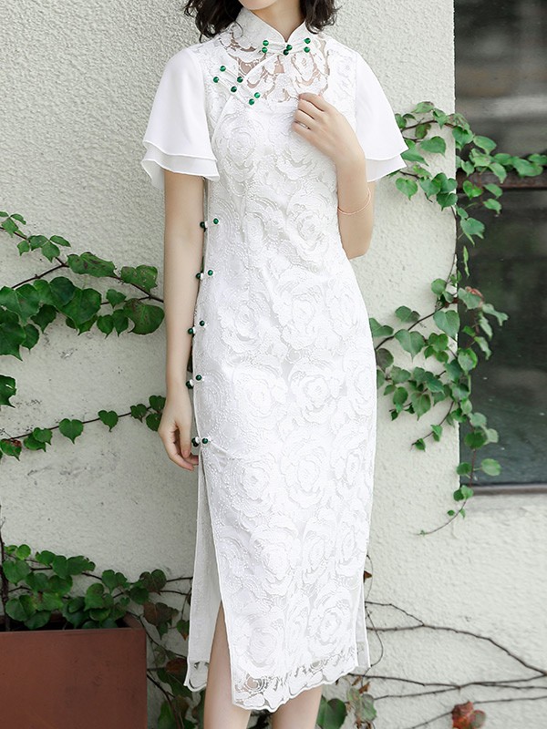 White Lace Mid Modern Qipao / Cheongsam Dress with Flutter Sleeve